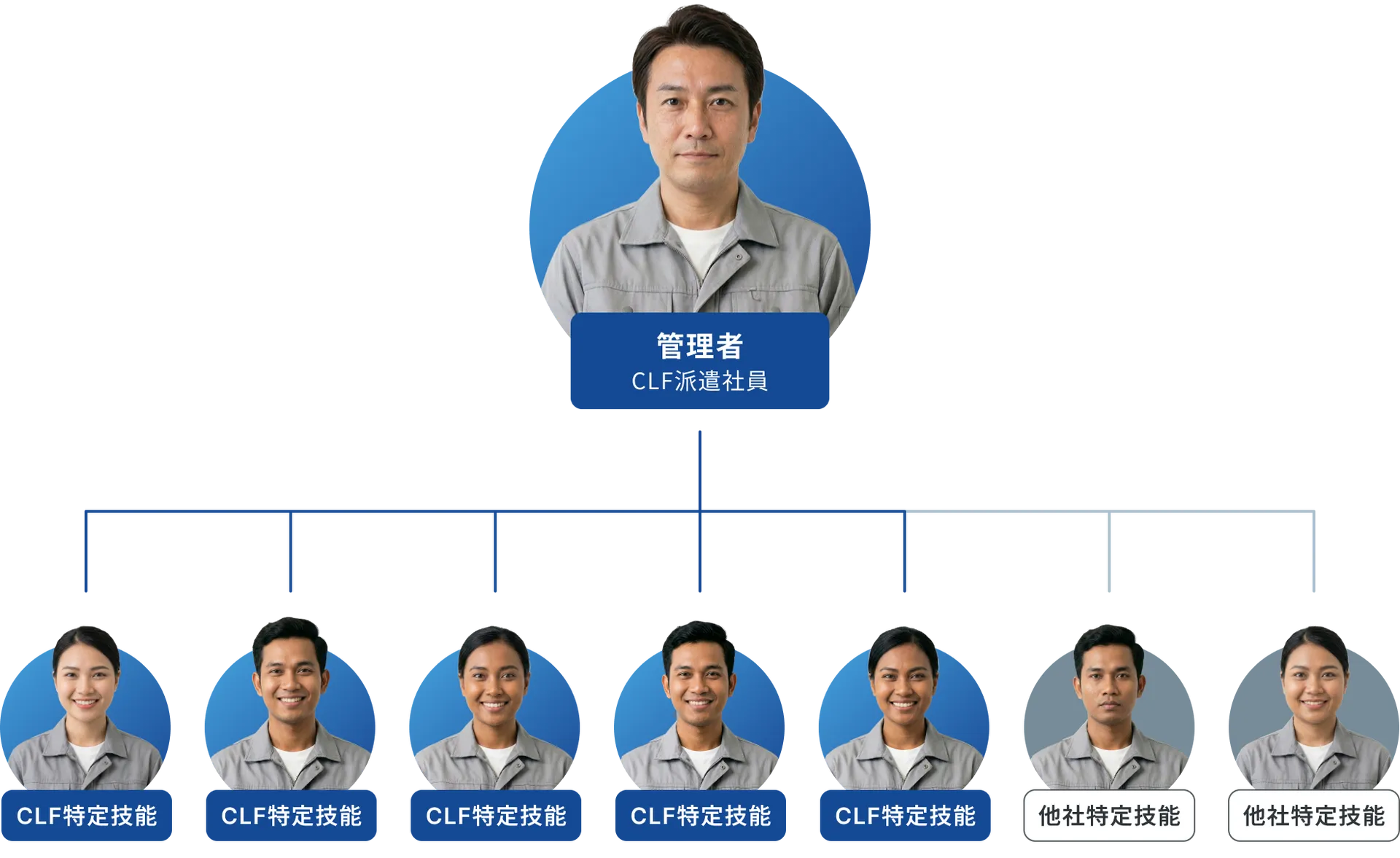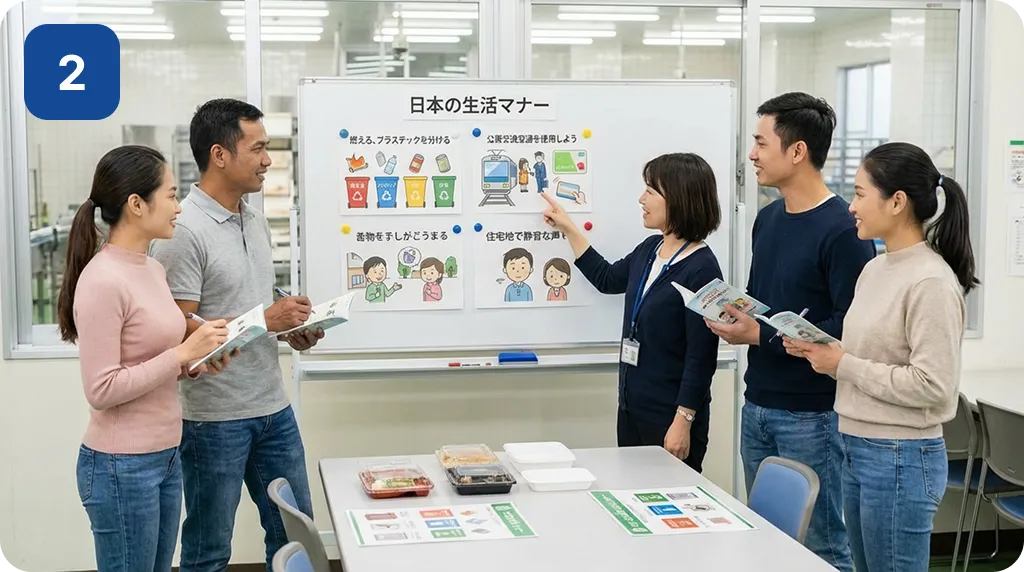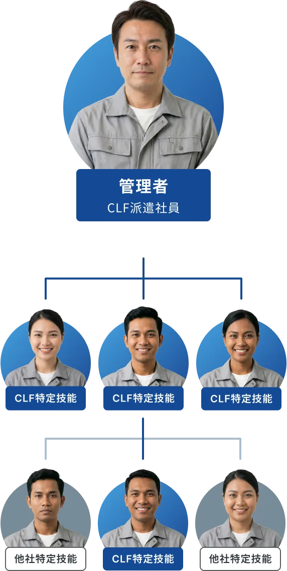 すでに複数社から紹介された特定技能スタッフがいる企業でも、キャリアリンクファクトリーの管理者が「勤怠」「通訳」「生活支援」「教育」をまとめて担当できます。