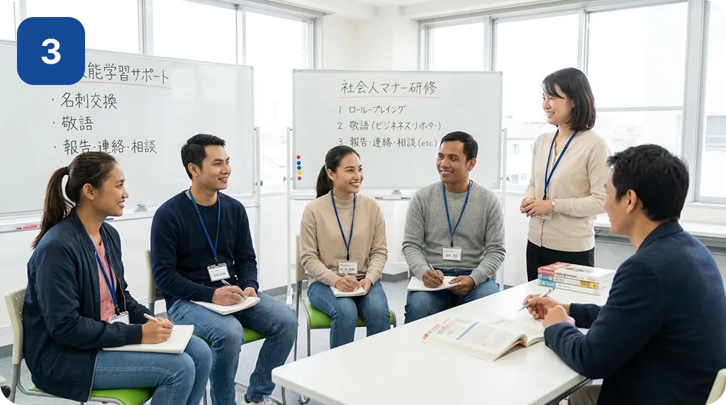 全国の専門学校と連携し、学生に対して特定技能の学習サポートや育成に加え、社会人として必要なマナー研修も実施しています。研修を通じてしっかり準備を整えたうえで就職サポートも行い、安心して現場へ送り出しています。